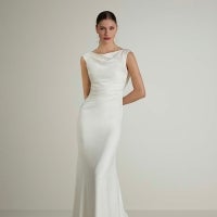 Mermaid wedding dress with asymmetrical neckline with asymmetrical sleeves in crepe