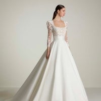 Sheath wedding dress with square neckline with three quarter sleeves in crepe