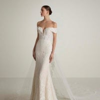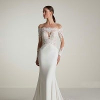 Mermaid wedding dress with off-shoulder neckline with long sleeves in crepe